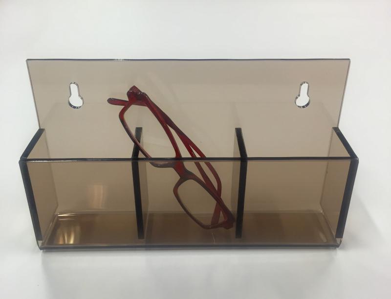 Holder for goggles with openings in the bottom to facilitate cleaning. Easy to rinse. Suitable for 3 pairs. 230x140x55mm smoke shaded plexi glass