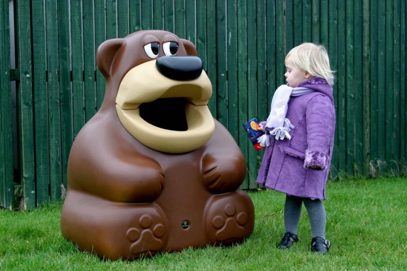 Nice high quality litter bin. Easy to empty. Rotational Molded Durapol = bold plastic that can withstand abuse. Graffiti is simply washed away. Zinc-treated steel barrel. Very stable and durable construction for indoor swimming pool environment.