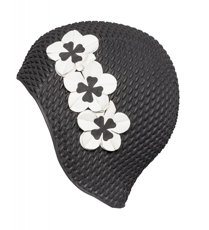 A beautiful swimming cap with three small flowwers on the side. perfect for cashiers sales