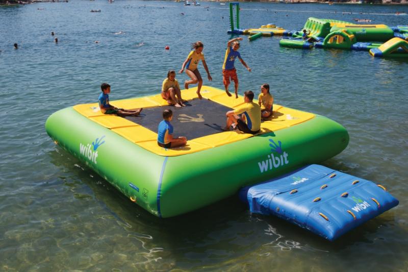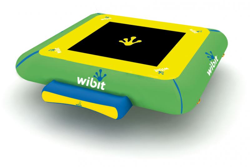 Unique square water trampoline. The two docking stations on the edges may be used to attach other Wibit products. This enables a number of options for water play