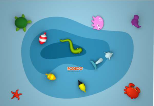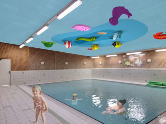 Takdekorationer skapar en fantasivärld i taket över bassängen, figurer gjorda i glasfiber som klarar simhallens tuffa miljö.