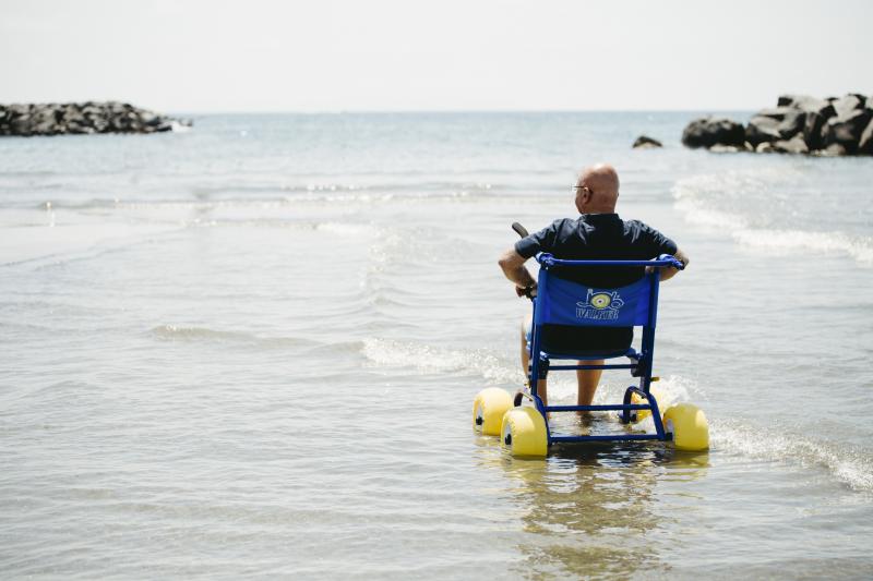 Med denna rullator kan personer med funktionshinder förflytta sig i tuffa miljöer utomhus som på stranden och ner i vattnet, samt vid poolen. Denna kan även användas ute i snön. Hjulen är av ett plastmaterial och de stora hjulen gör att rullatorn inte sjunker ner i marken. Ramen är tillverkad i pulverlackerad aluminium för att klara salt- och pool vatten. Önskar man sätta sig ner och vila är det bara att fälla ut stolen som är gjord i robust tyg som torkar snabbt.