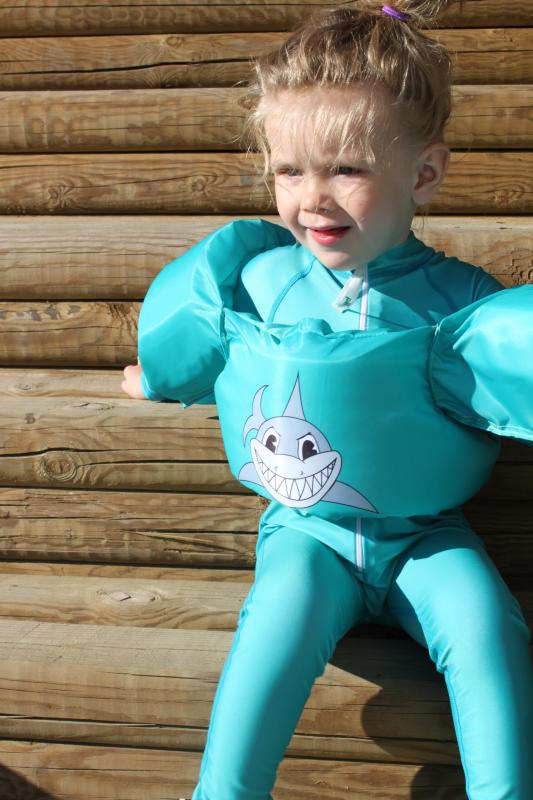 Den har en behaglig passform i ett mjukt tygmateriel som tillåter barnet att fritt röra sig när hen utforskar och simmar i vatten.